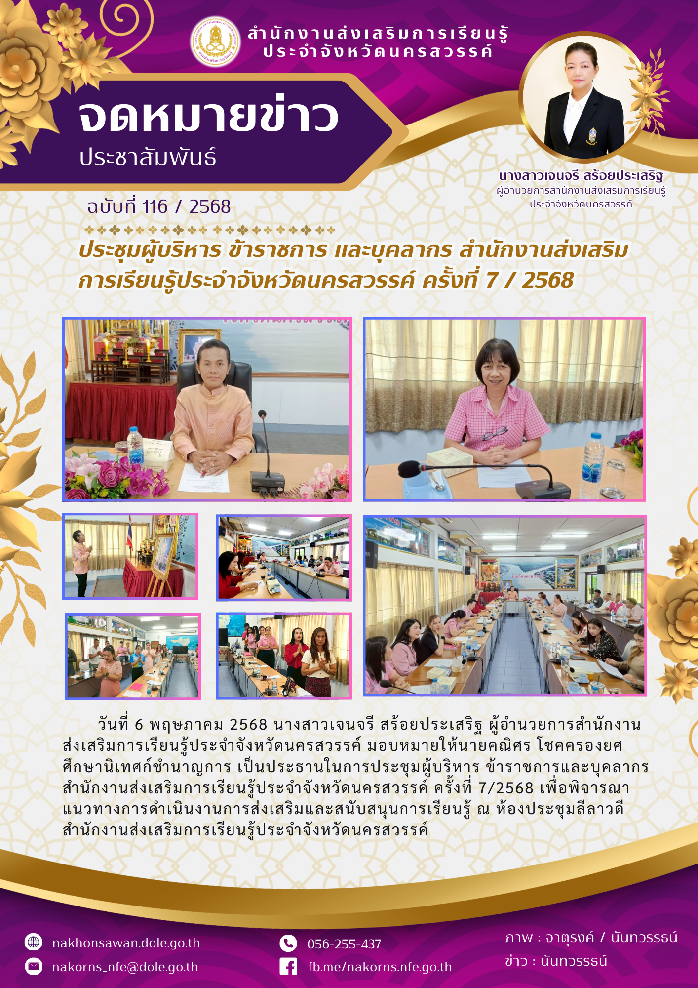 วันที่ 9 ธันวาคม 2568 เวลา 10.30 น. นายมงคลชัย ศรีสะอาด ผู้อำนวยการสำนักงานส่งเสริมการเรียนรู้ประจำจังหวัดนครสวรรค์ เป็นประธานในการประชุมผู้บริหาร หัวหน้ากลุ่มงาน และเจ้าหน้าที่ผู้เกี่ยวข้อง ของสำนักงานส่งเสริมการเรียนรู้ประจำจังหวัดนครสวรรค์ ครั้งที่ 12/2568 โดยมีผู้บริหารสถานศึกษา ข้าราชการครู และบุคลากรผู้เกี่ยวข้อง เข้าร่วมการประชุม เพื่อหารือและพิจารณาการดำเนินการส่งเสริมการเรียนรู้ และการดำเนินการตามนโยบายของดร.เกศทิพย์ ศุภวานิช อธิบดีกรมส่งเสริมการเรียนรู้ ณ ห้องประชุมพิกุลทอง สำนักงานส่งเสริมการเรียนรู้ประจำจังหวัดนครสวรรค์