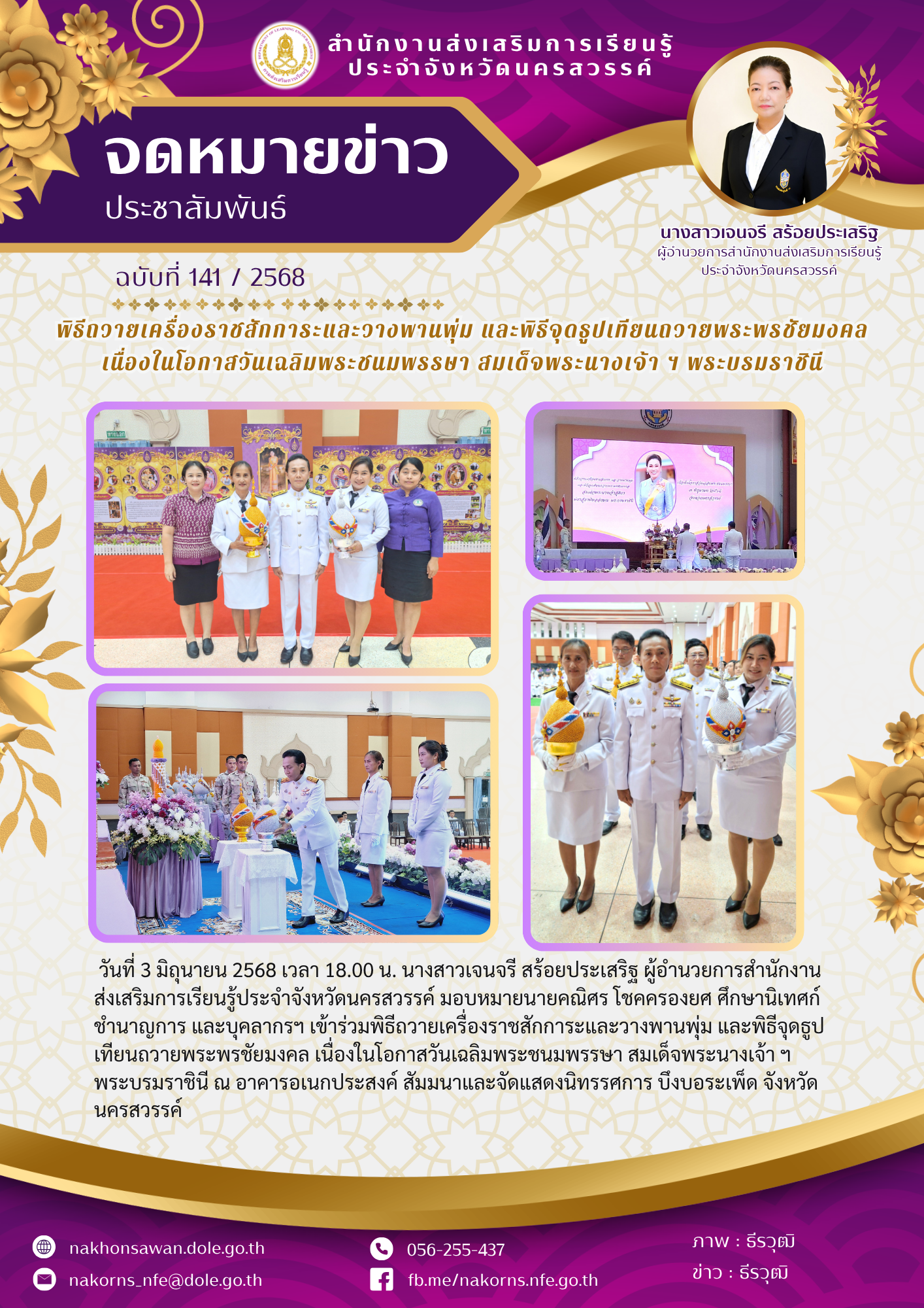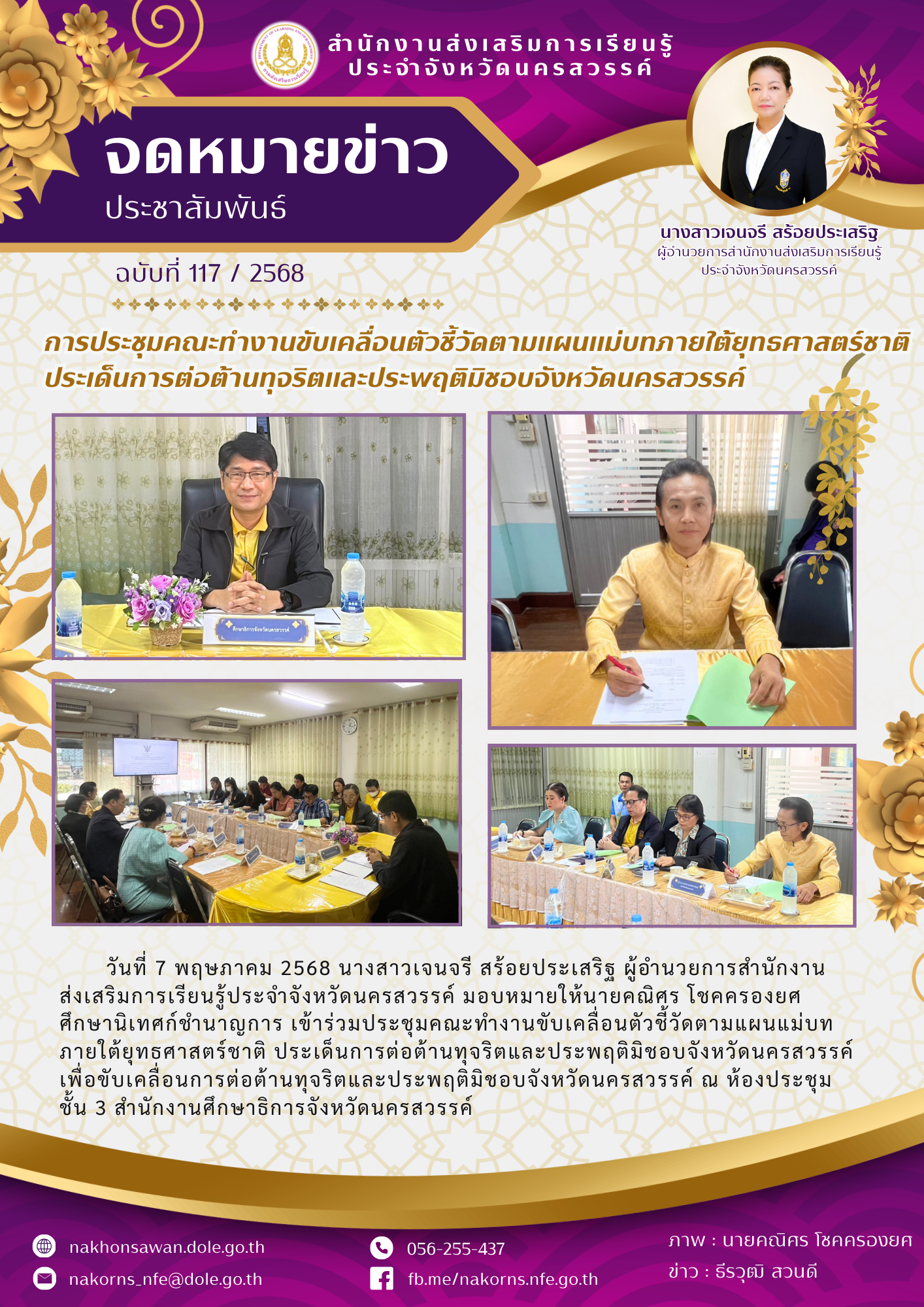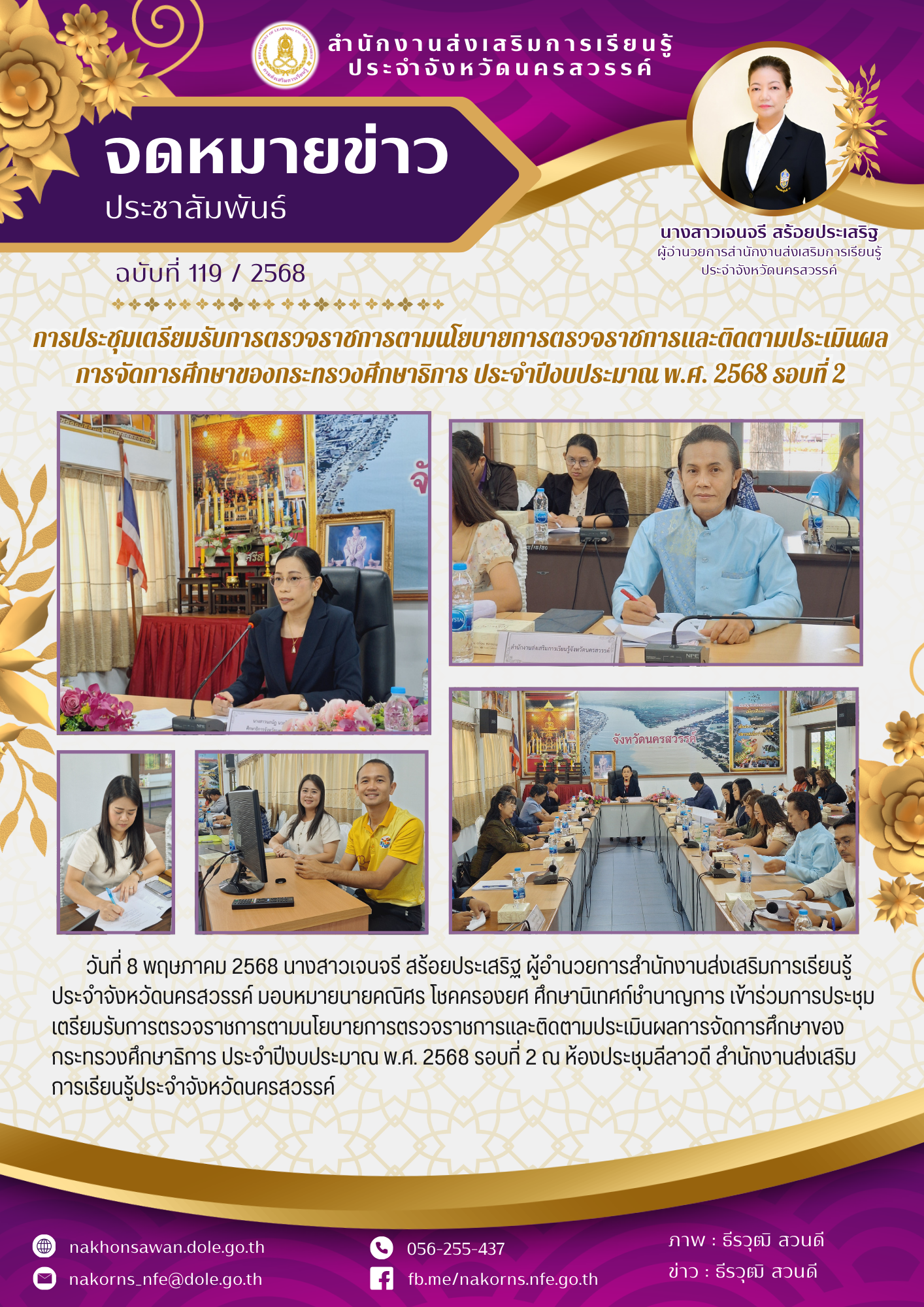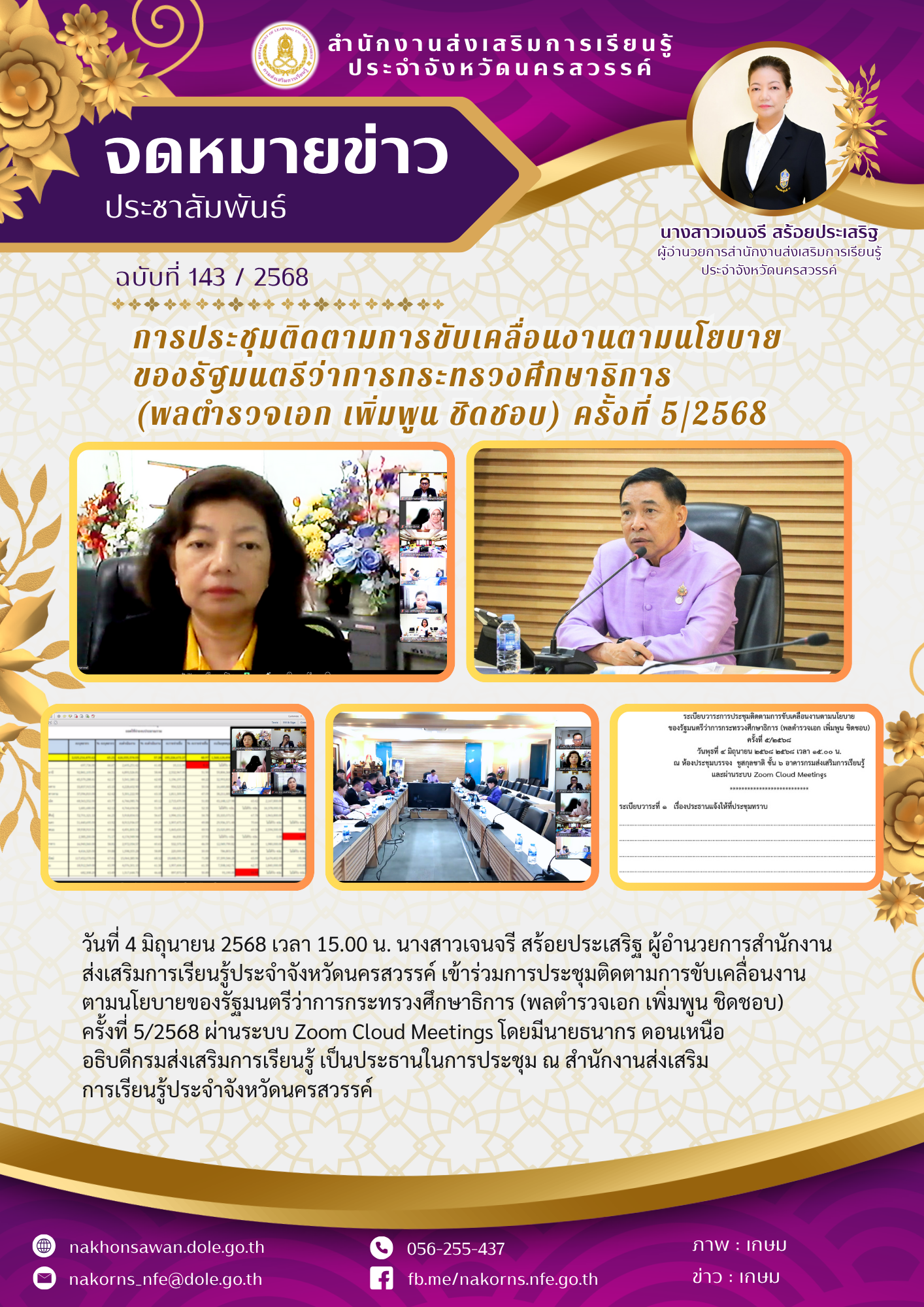 วันที่ 9 ธันวาคม 2568 เวลา 08.30 น. นายมงคลชัย ศรีสะอาด ผู้อำนวยการสำนักงานส่งเสริมการเรียนรู้ประจำจังหวัดนครสวรรค์ พร้อมด้วยผู้บริหารสถานศึกษา ข้าราชการครู และบุคลากรในสังกัด เข้าร่วมการประชุมผู้บริหารกรมส่งเสริมการเรียนรู้ ครั้งที่ 2/2568 โดยมี ดร.เกศทิพย์ ศุภวานิช อธิบดีกรมส่งเสริมการเรียนรู้ เป็นประธานในการประชุม ตามกำหนดการประชุมผู้บริหารกรมส่งเสริมการเรียนรู้ ประจำปี 2568 ผ่านระบบ Zoom Workplace ณ ห้องประชุมพิกุลทอง สำนักงานส่งเสริมการเรียนรู้ประจำจังหวัดนครสวรรค์
